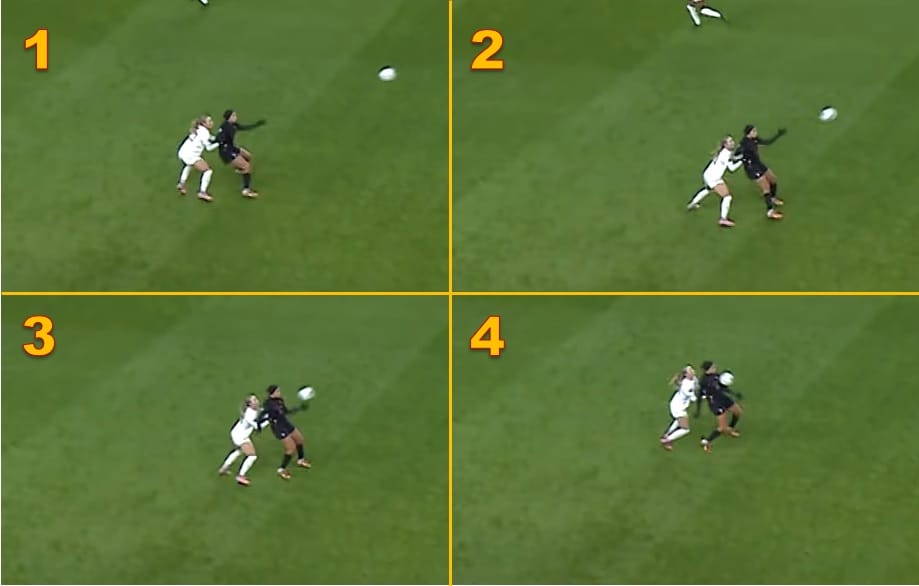 Then, using her arms to wrestle the defender and take control of the duel, pushing her marker off and opening up so she can play a nice forward pass into space for her teammate.