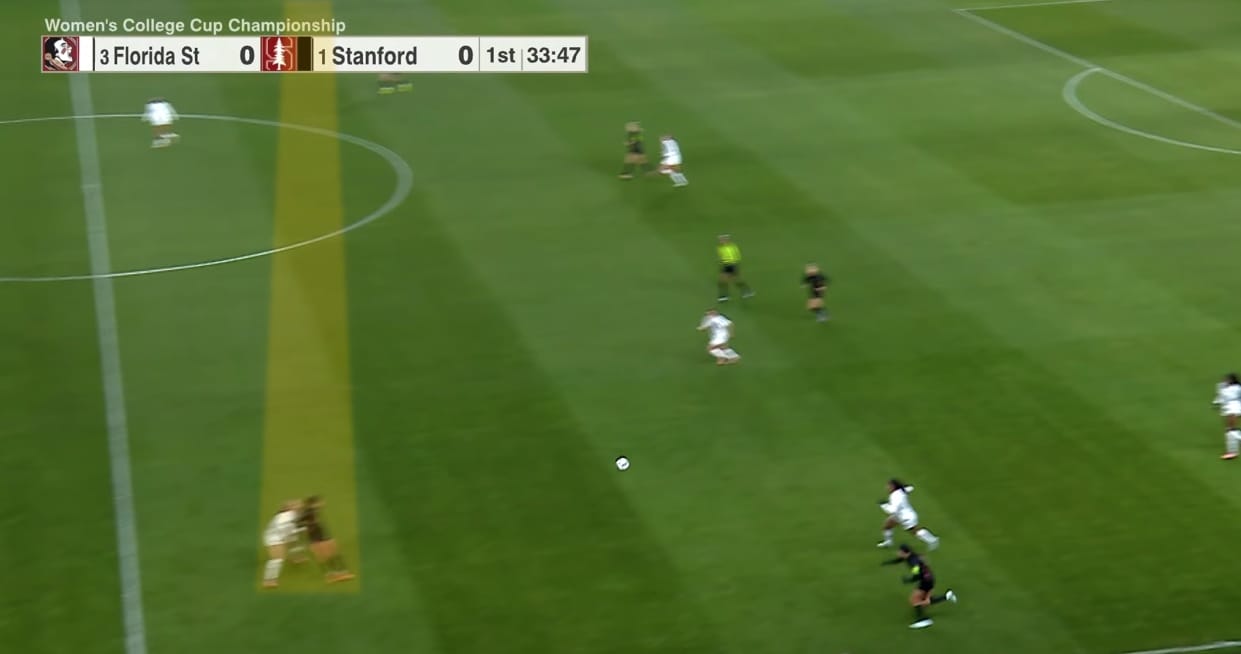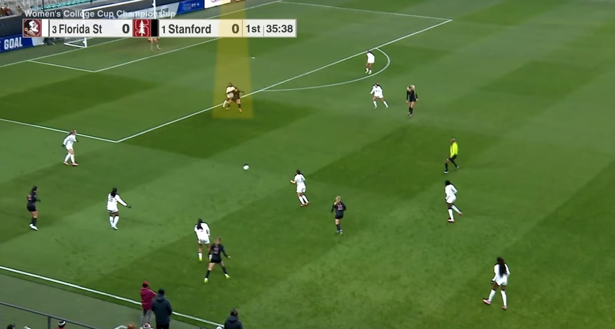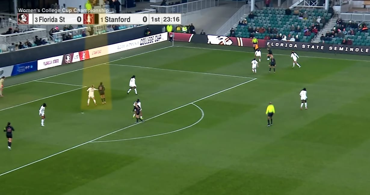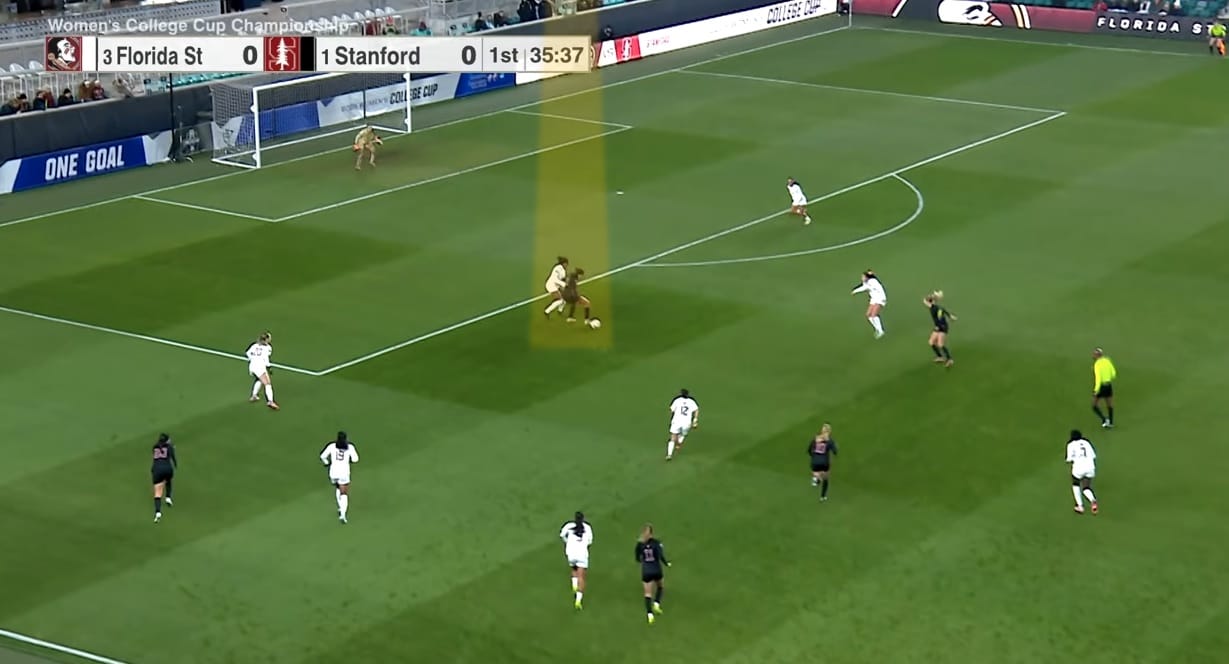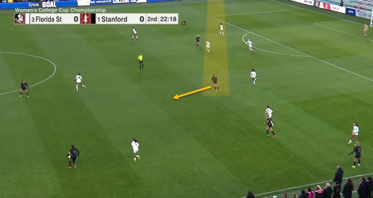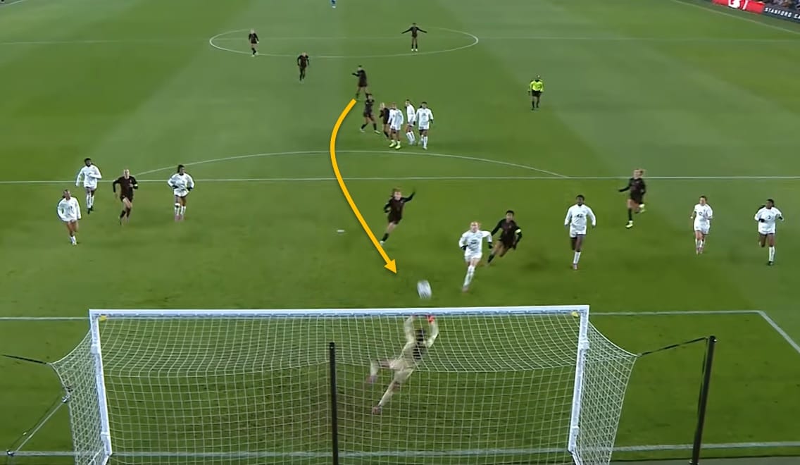 She's in front of the defender too early here, well before the cross comes in. That means her marker can see both Aikey and the ball. Even if that ball comes Aikey's way, it's easier for the defender to mark her, intercept the ball or get in the way of her shot.