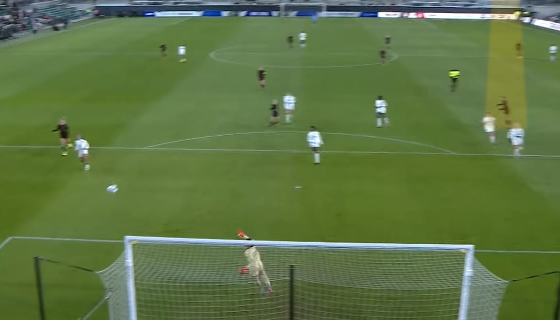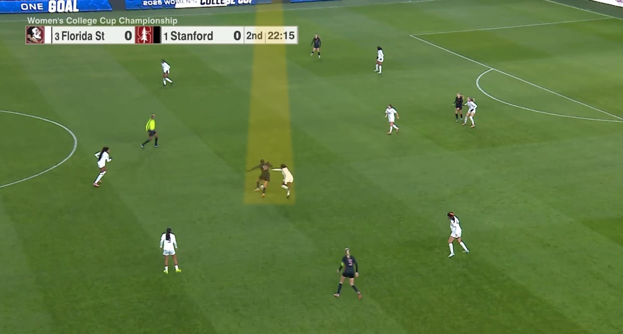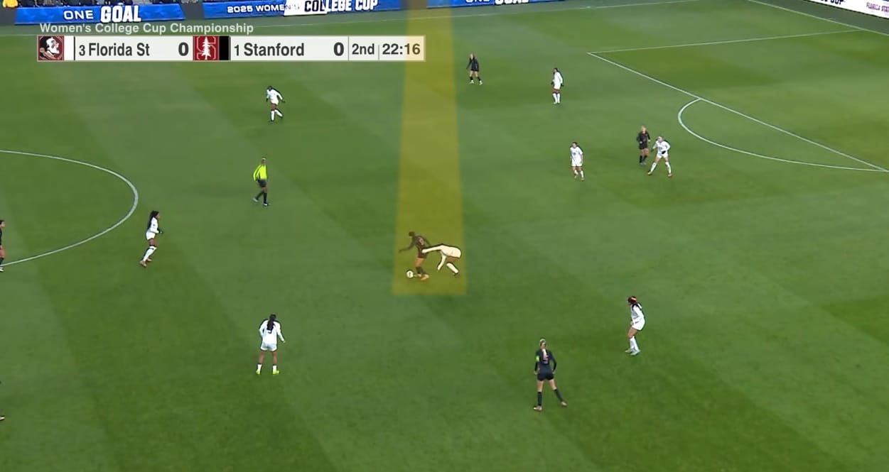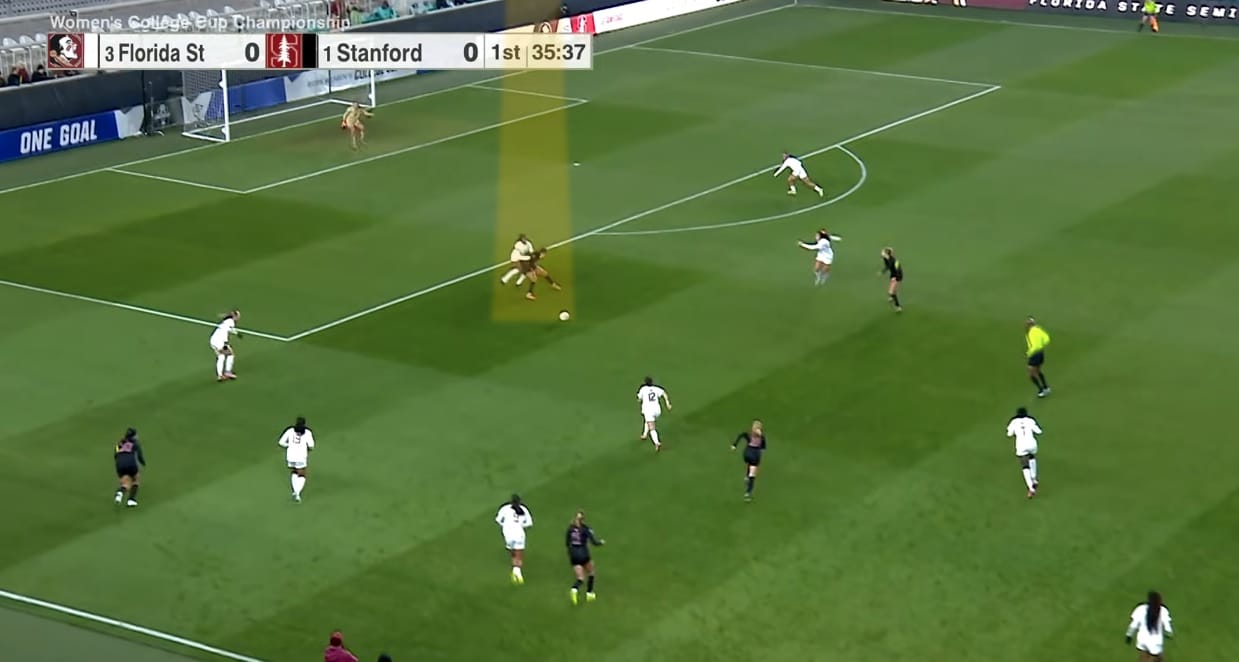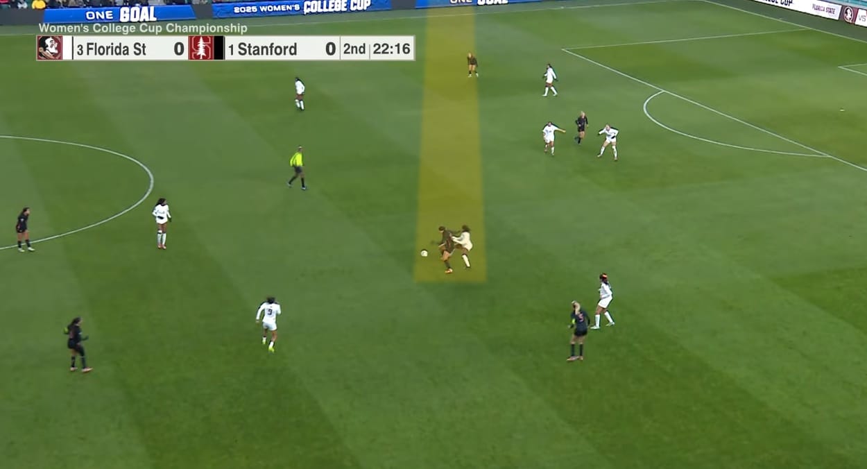 She's in front of the defender too early here, well before the cross comes in. That means her marker can see both Aikey and the ball. Even if that ball comes Aikey's way, it's easier for the defender to mark her, intercept the ball or get in the way of her shot.