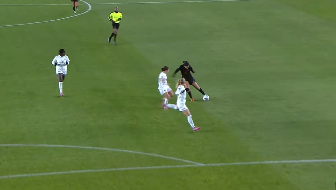 Evidently, Aikey can play on a defender. But there were also times in this game where she peeled off the defender and went short for the ball into feet, to lay off or turn and go herself.