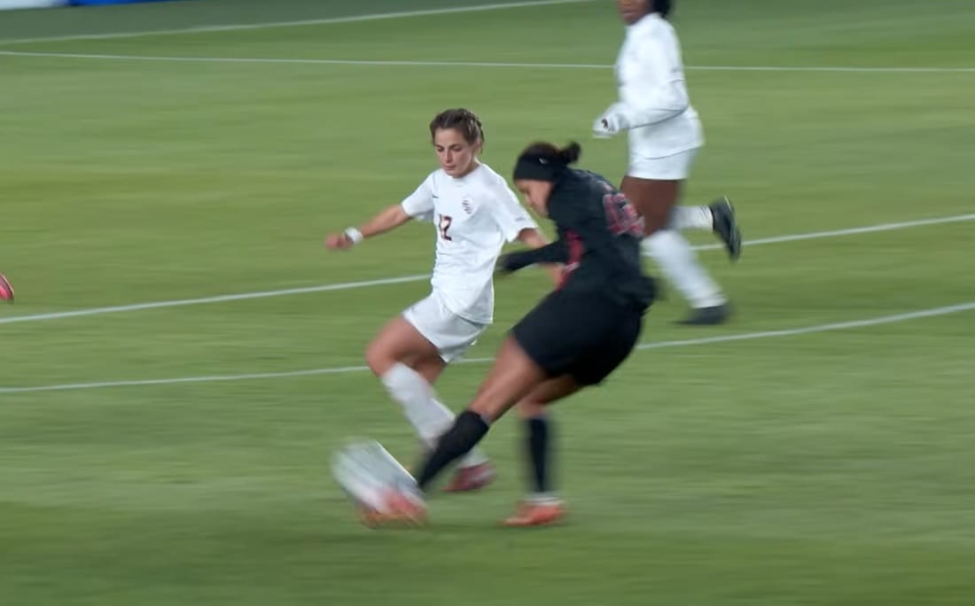 This is a show of core strength, as the defender runs into Aikey and loses her footing. Aikey, meanwhile, bounces off her and keeps going, eventually drawing a foul.