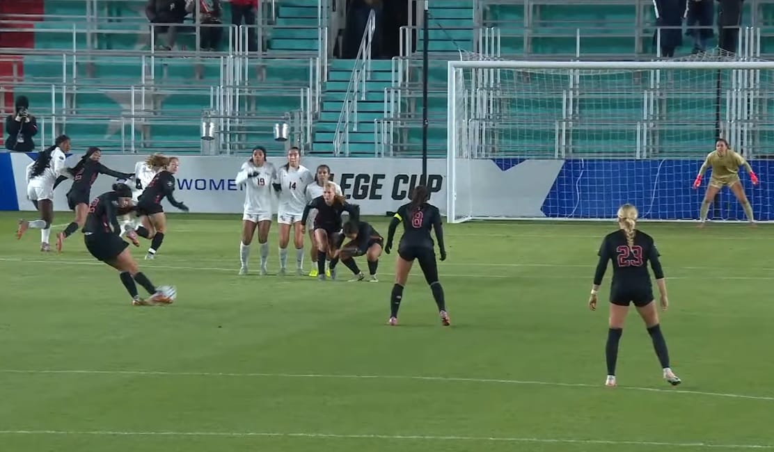 The next one is on her right foot, a direct free kick from way out, where most would loft the ball in for someone else to head.