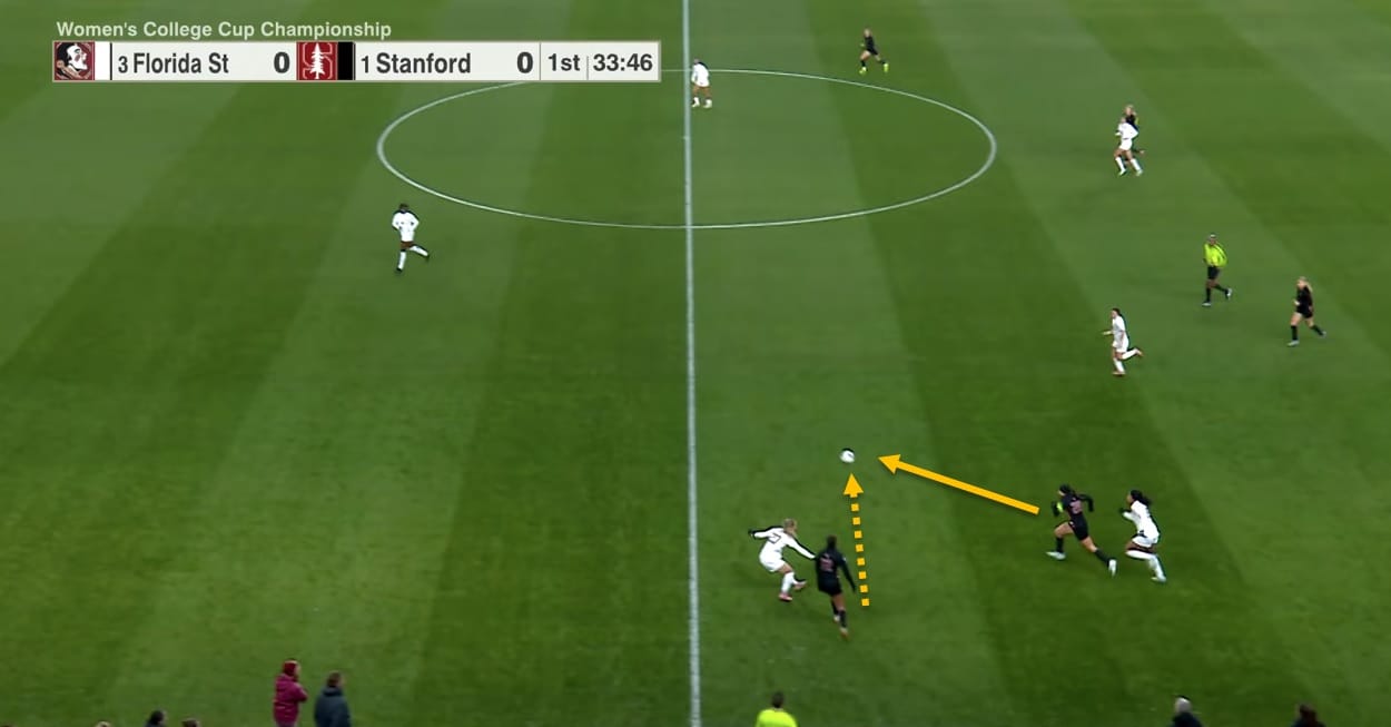 Pass is to her preferred right foot, which is her back foot here, so she's a bit more open receiving and the marker senses an opportunity to come around and swipe the ball away. Aikey prepares in advance, gets her lead arm out to hold the defender at bay.