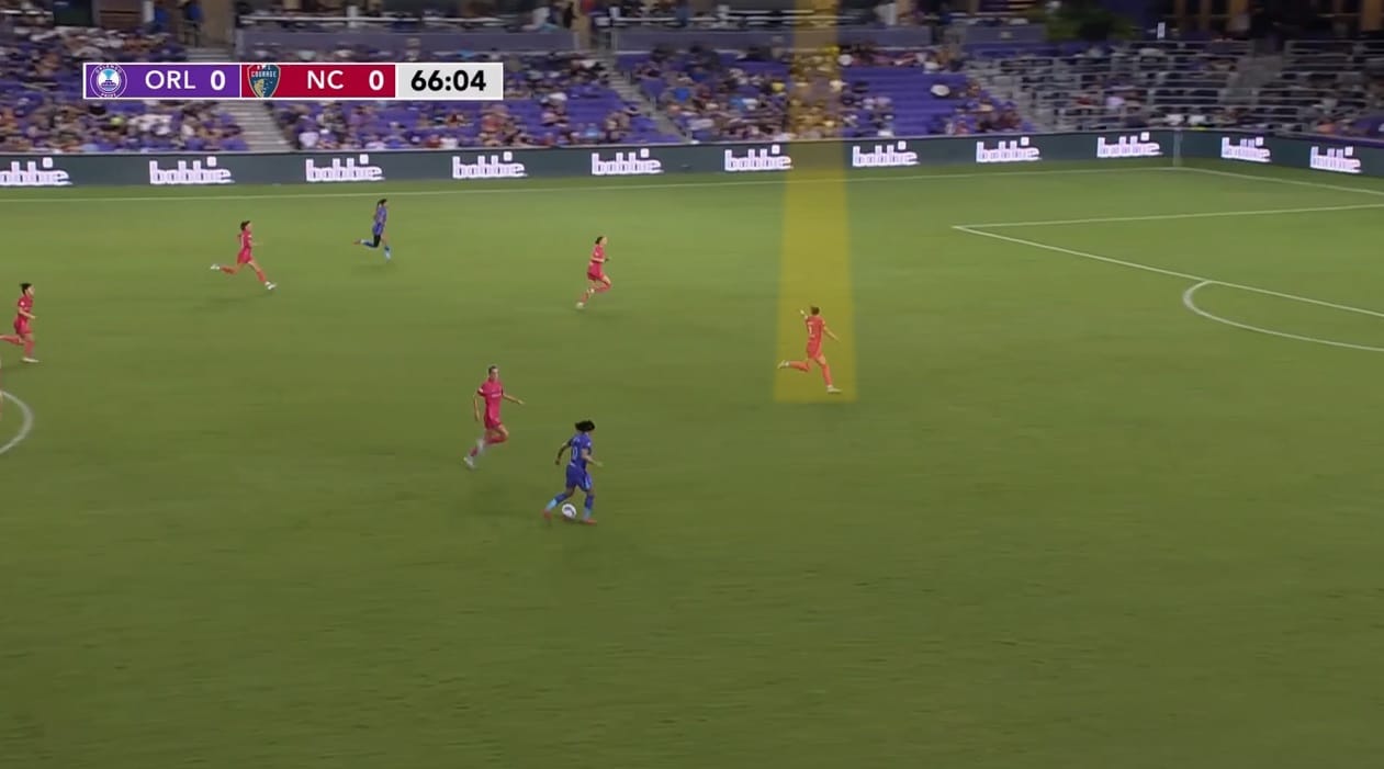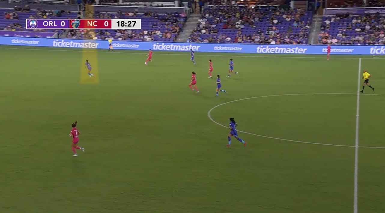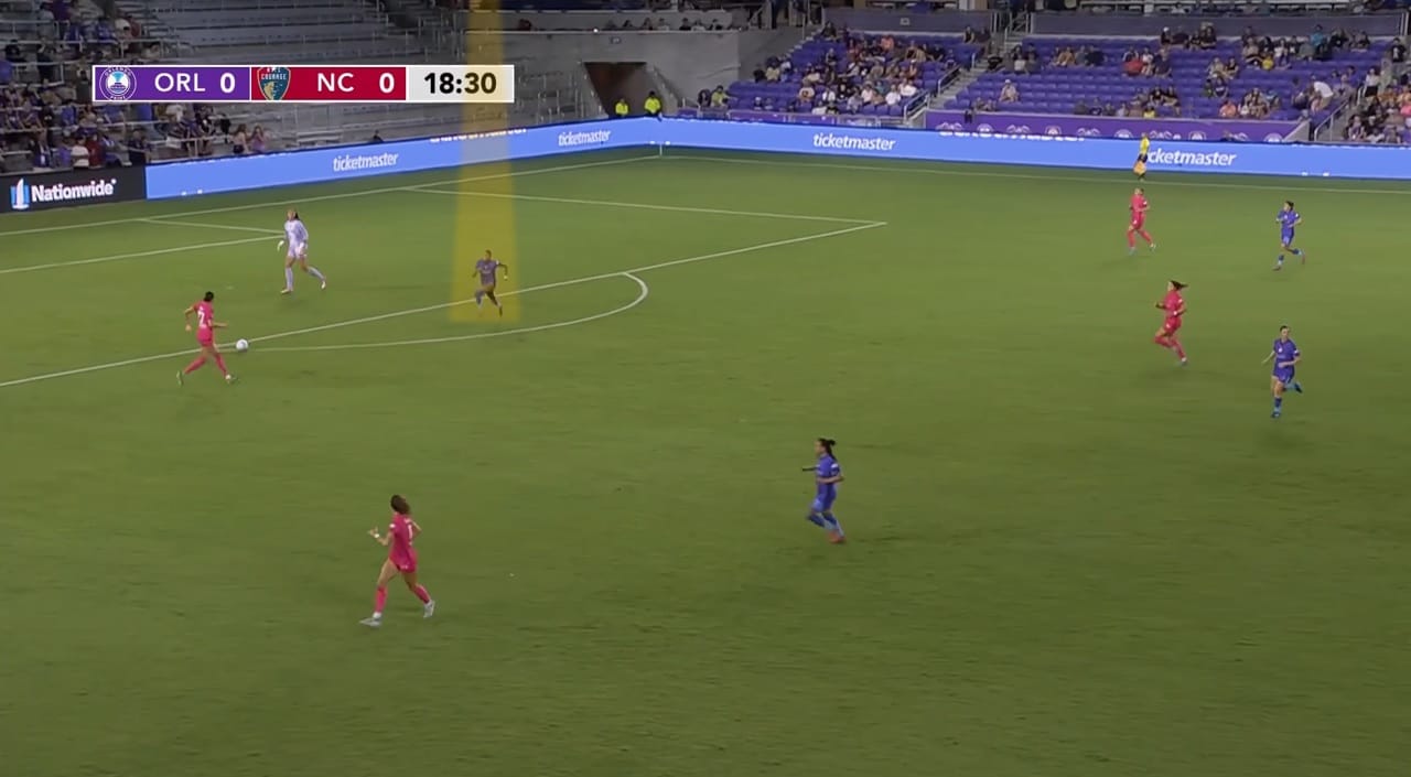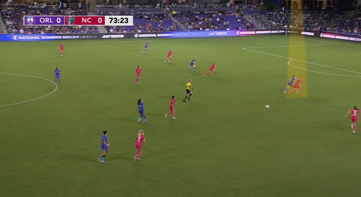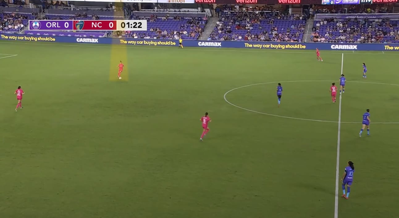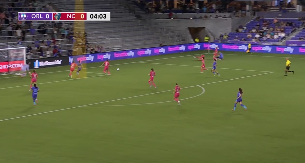 Watt is proactive and as North Carolina builds down the left, she gets in position to keep them there. Splitting the centre-backs like this makes the opponent’s attacking play more predictable, limiting their options. You can see how tight Orlando’s midfield gets to their direct opponents, because they know these are Kurtz’s only options.