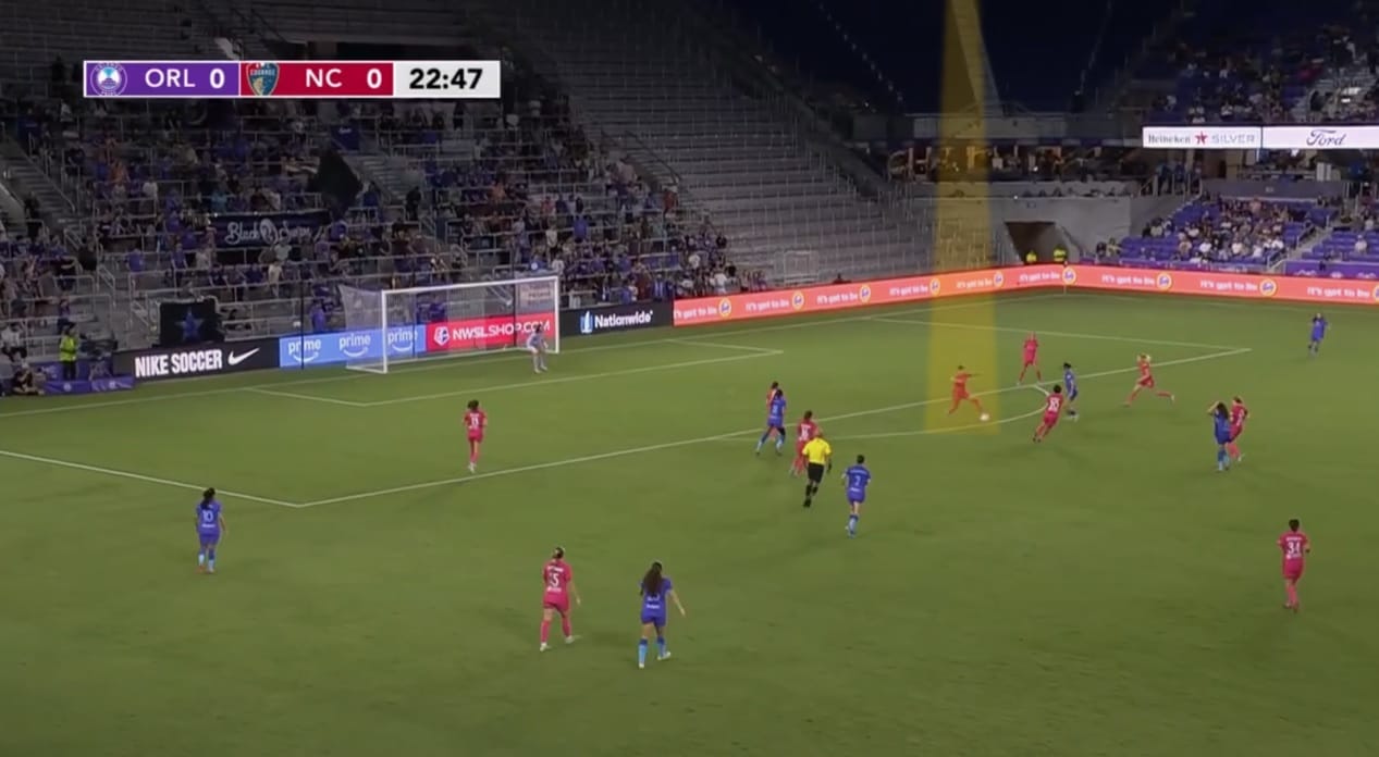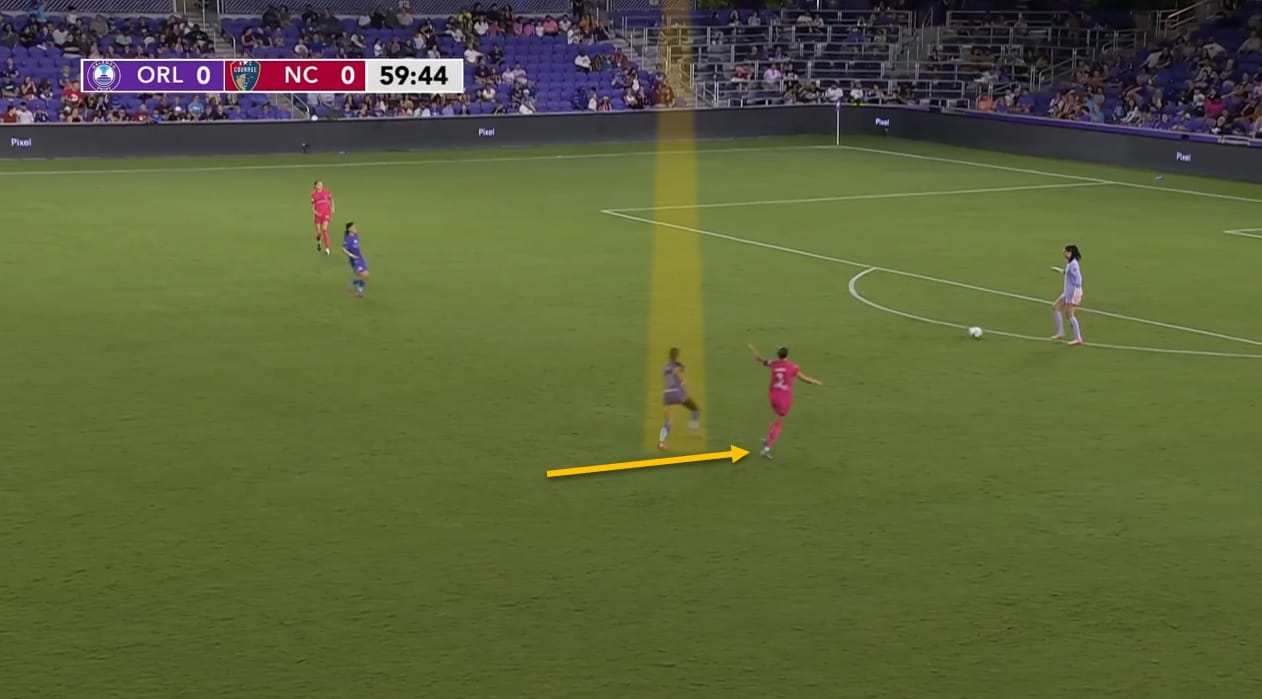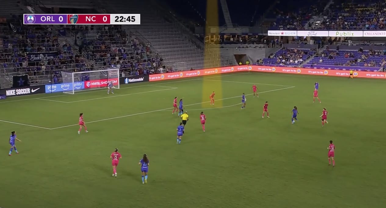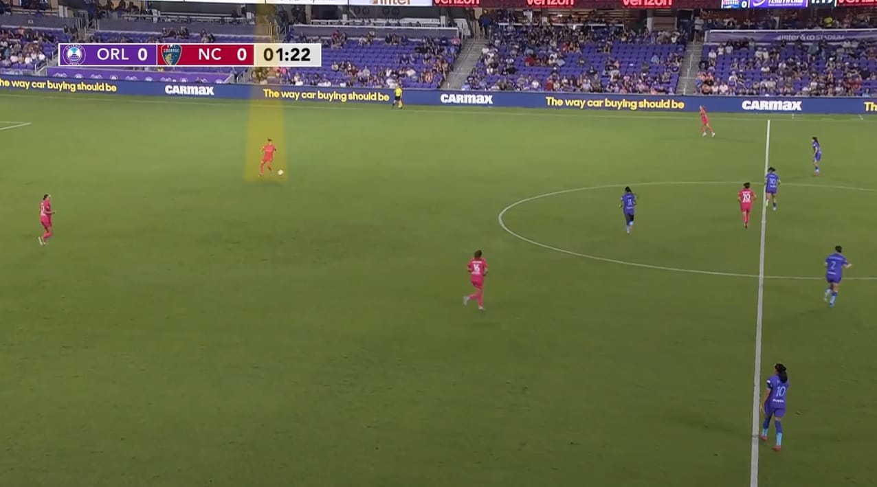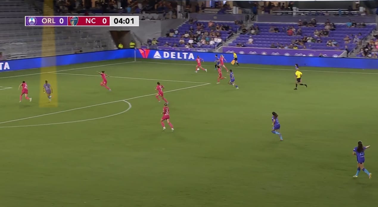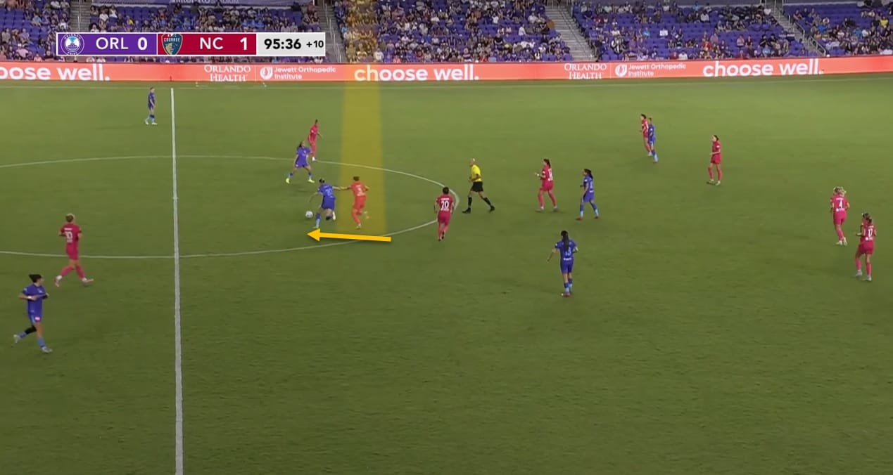 Watt is proactive and as North Carolina builds down the left, she gets in position to keep them there. Splitting the centre-backs like this makes the opponent’s attacking play more predictable, limiting their options. You can see how tight Orlando’s midfield gets to their direct opponents, because they know these are Kurtz’s only options.