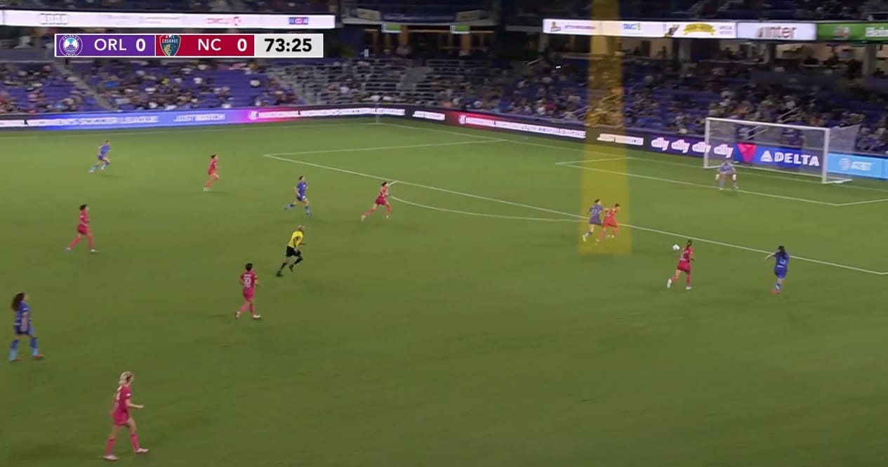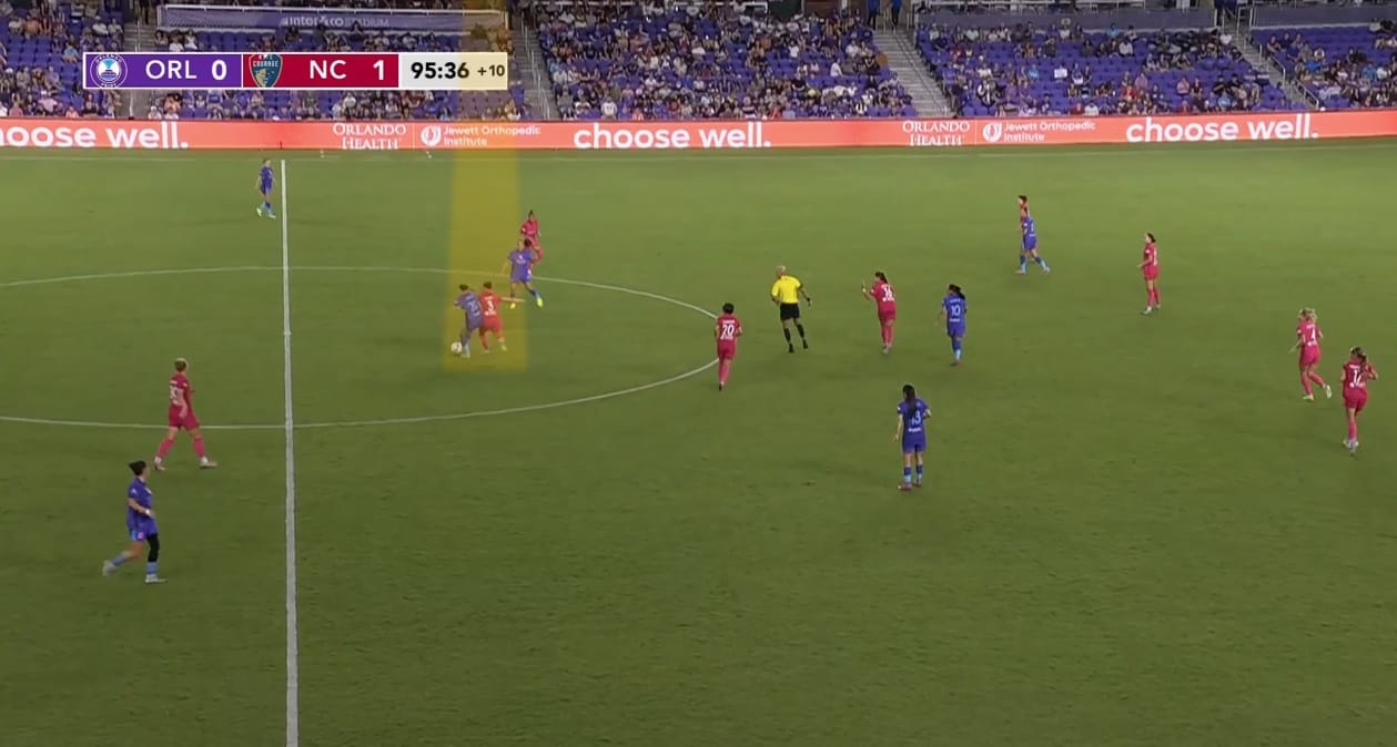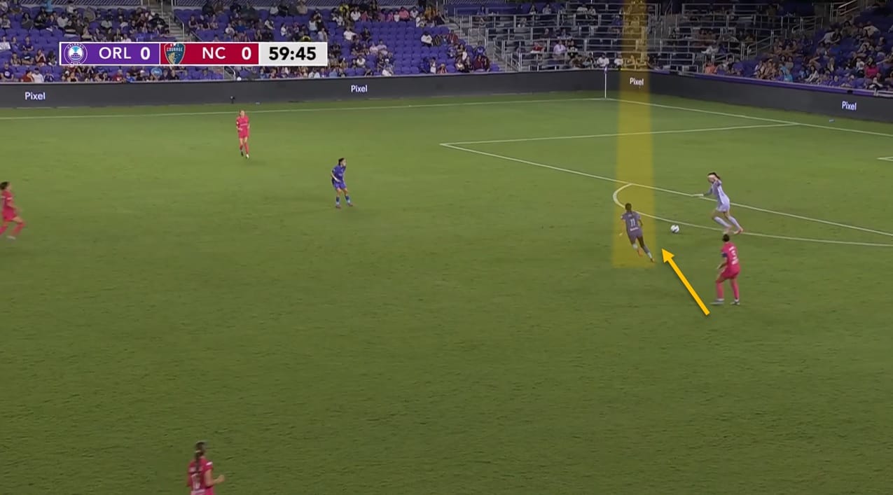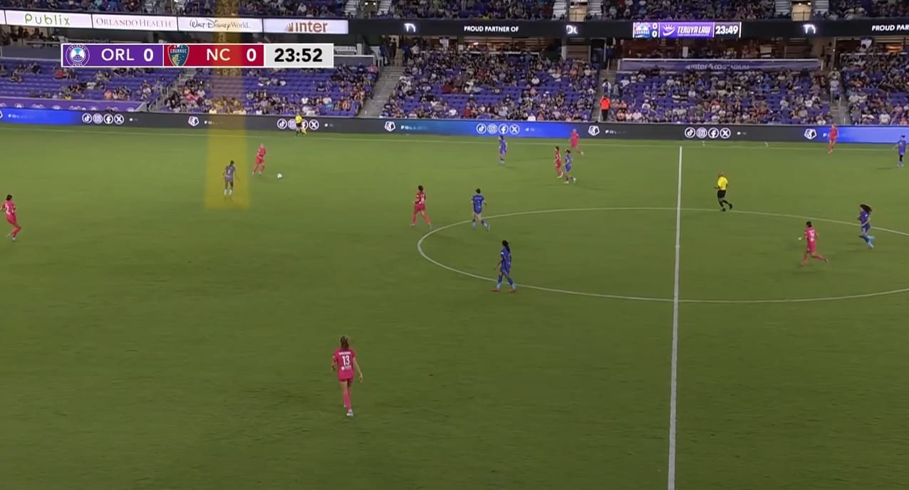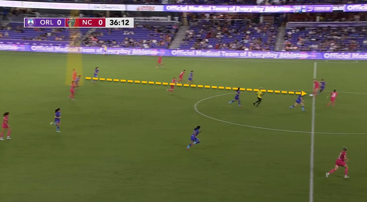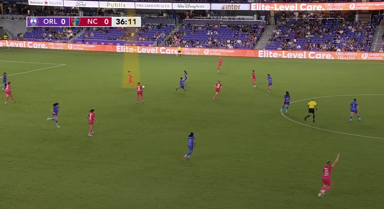 Watt is proactive and as North Carolina builds down the left, she gets in position to keep them there. Splitting the centre-backs like this makes the opponent’s attacking play more predictable, limiting their options. You can see how tight Orlando’s midfield gets to their direct opponents, because they know these are Kurtz’s only options.