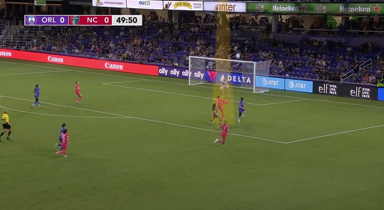 This is a horrible bounce, but Kurtz deals with it and gets right under it with her left foot. No dangerous loose balls or second wave attacking opportunities here—if Orlando score it will be from Row Z. Kurtz’s flexibility really stood out on this play. Her follow through takes her left knee to chest level. Other defenders would end up trying and failing to head it out for a corner or giving it away.